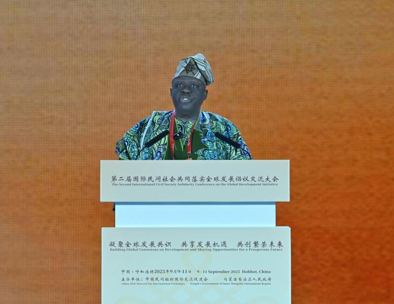 9月10日,貝寧國民議會議長弗拉沃努在第二屆國際民間社會共同落實(shí)全球發(fā)展倡議交流大會開幕式上致辭。草原云·內(nèi)蒙古新聞網(wǎng)記者 馬建兵 攝
