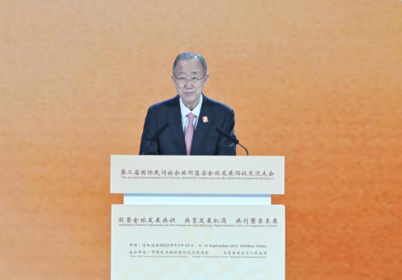 9月10日,聯(lián)合國第八任秘書長潘基文在第二屆國際民間社會共同落實(shí)全球發(fā)展倡議交流大會開幕式上致辭。草原云·內(nèi)蒙古新聞網(wǎng)記者 馬建兵 攝