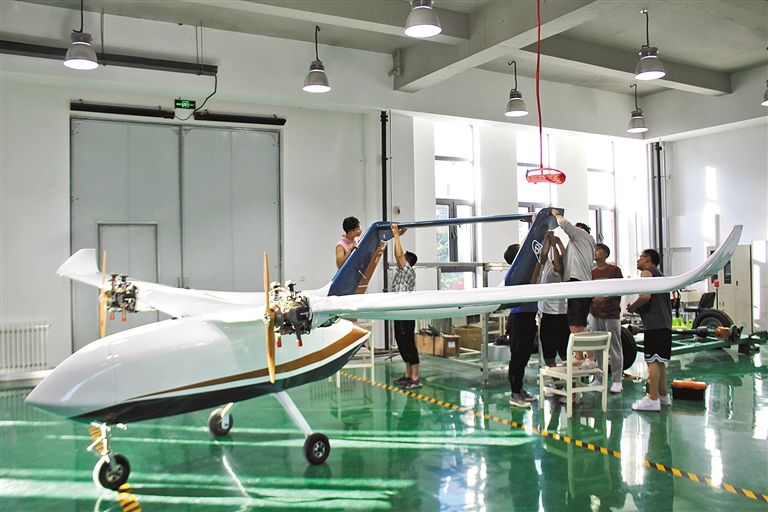 內(nèi)蒙古工業(yè)大學(xué)智能裝備研究院工作人員正在進行TS300長航時大載重固定翼無人運輸機室內(nèi)組裝工作。