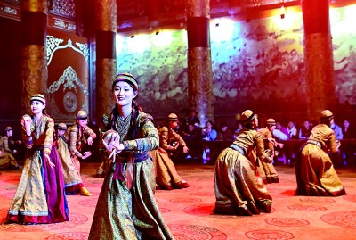 在鄂爾多斯文化產業(yè)園景區(qū)沉浸式劇場,演員表演實景劇《鳳鳴九曲》。新華社發(fā)