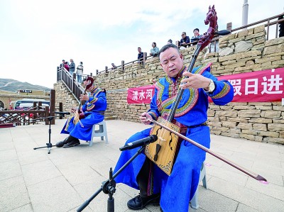 在內蒙古自治區(qū)呼和浩特市清水河縣老牛灣村,身穿民族服裝的工作人員在演奏民族樂器。新華社發(fā)