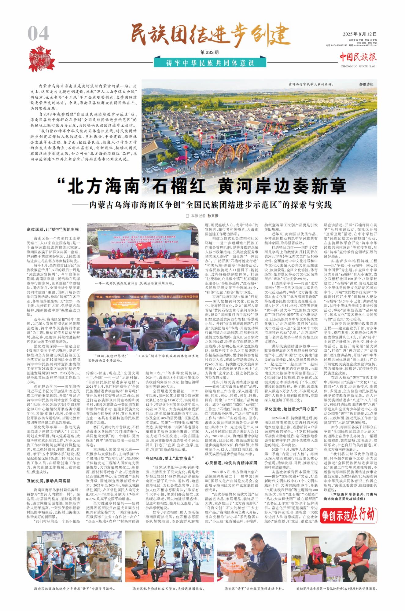 2025年8月12日,《中國民族報(bào)》第4版刊發(fā)整版文章《“北方海南”石榴紅 黃河岸邊奏新章——內(nèi)蒙古烏海市海南區(qū)爭創(chuàng)“全國民族團(tuán)結(jié)進(jìn)步示范區(qū)”的探索與實(shí)踐》,報(bào)道了自2018年成功創(chuàng)建“自治區(qū)民族團(tuán)結(jié)進(jìn)步示范區(qū)”后,內(nèi)蒙古烏海市海南區(qū)各族干部群眾在爭創(chuàng)“全國民族團(tuán)結(jié)進(jìn)步示范區(qū)”的新征程上凝心聚力再出發(fā),共同唱響民族團(tuán)結(jié)進(jìn)步主旋律。