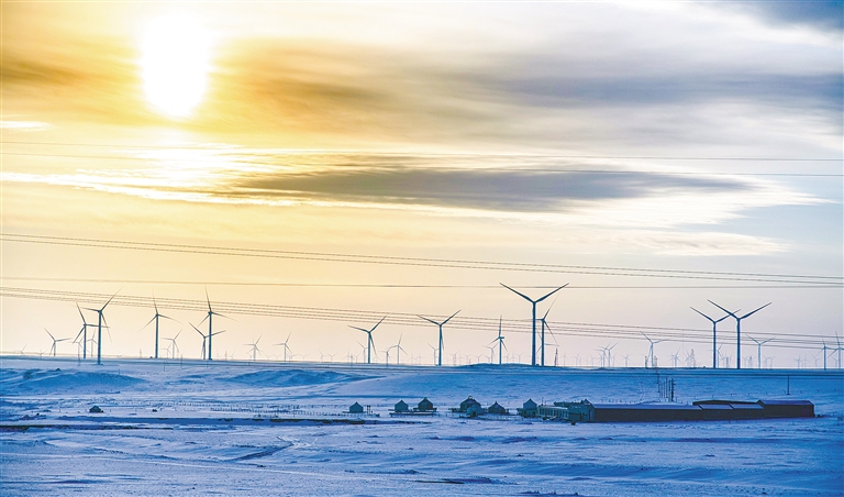 湛藍(lán)天幕之下,150座白色風(fēng)車如鋼鐵巨人般巍然矗立,巨大的風(fēng)機(jī)葉片迎風(fēng)轉(zhuǎn)動(dòng),劃破長風(fēng),發(fā)出低沉而均勻的呼嘯,與天地間的遼闊寂靜共鳴。
