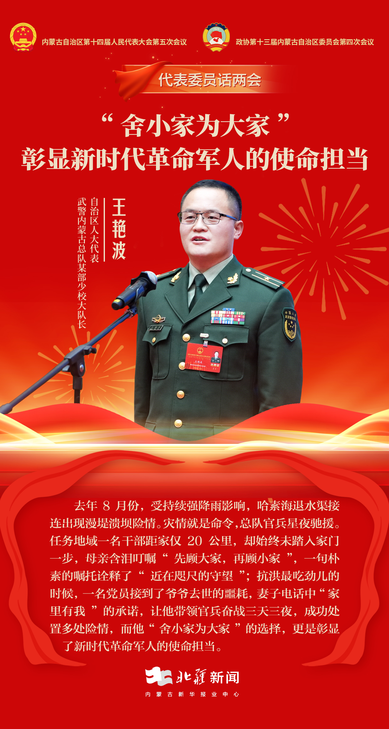 王艷波表示,內(nèi)蒙古是祖國的“北大門”、首都的“護城河”,總隊官兵肩負著守護118.3萬平方公里地區(qū)社會穩(wěn)定、保衛(wèi)群眾美好生活的重任。近年來,全體官兵圓滿完成中蒙博覽會、十四屆全國冬季運動會、自治區(qū)兩會等重大安保任務(wù),用忠誠與堅守踐行使命。