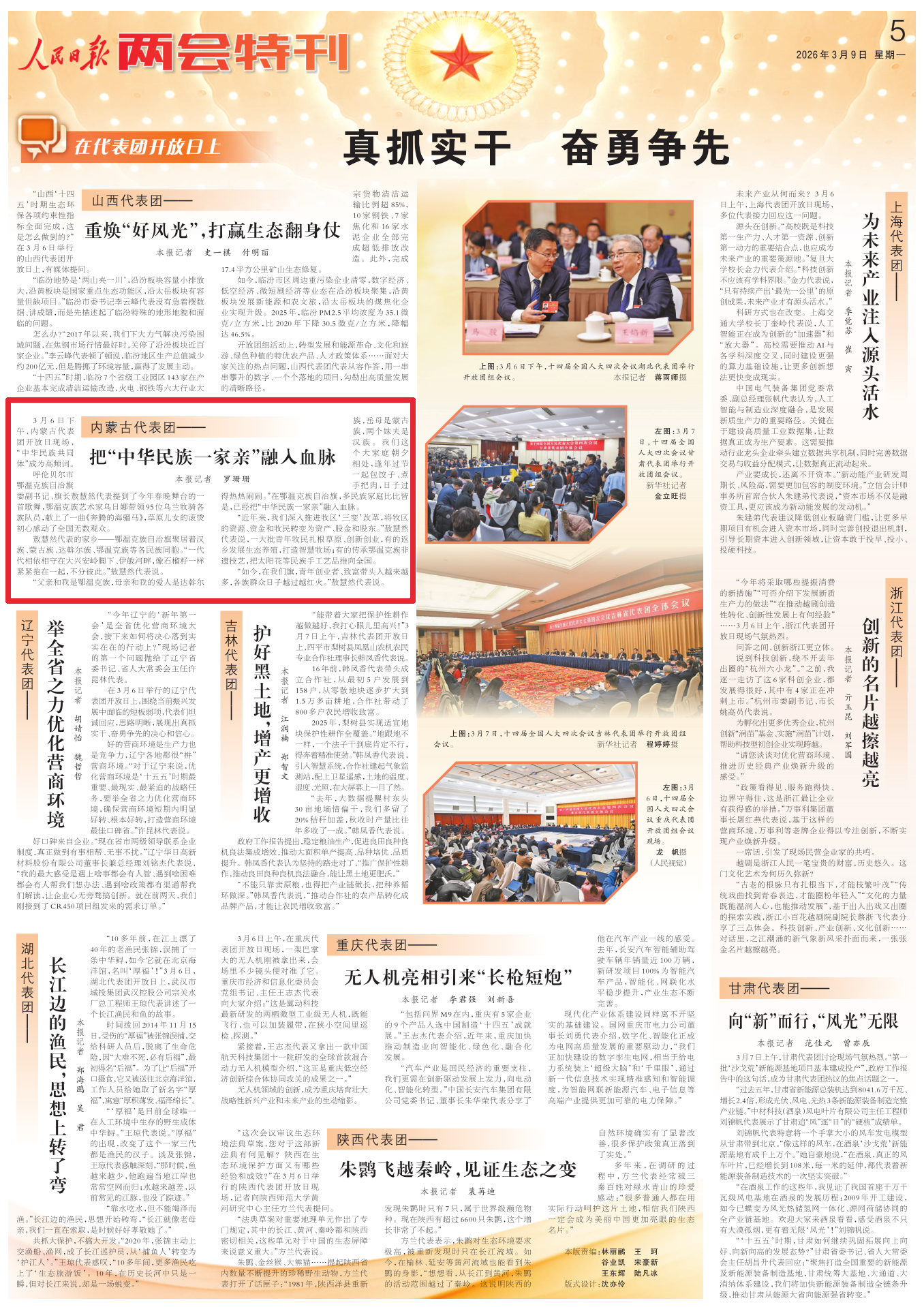 2026年3月9日,《人民日報(bào)》第5版刊發(fā)題為《內(nèi)蒙古代表團(tuán)——把“中華民族一家親”融入血脈》一文,報(bào)道了3月6日下午,內(nèi)蒙古代表團(tuán)開放日現(xiàn)場,“中華民族共同體”成為高頻詞。