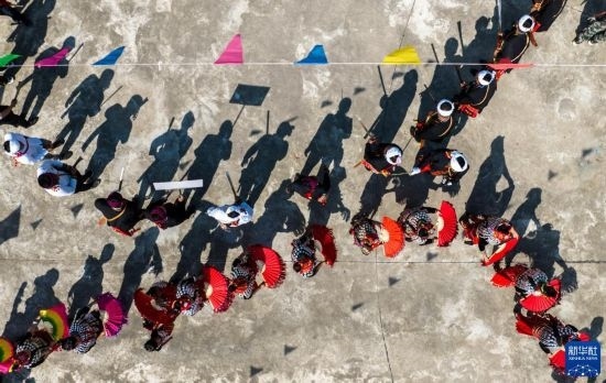 3月2日,當(dāng)?shù)厝罕娕c來自各地的游客踩著相同的鼓點(diǎn)進(jìn)場舞蹈(無人機(jī)照片)。