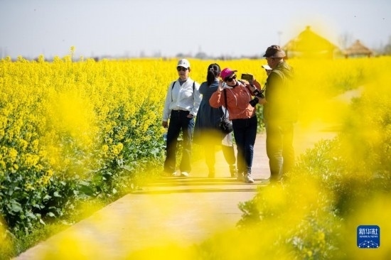 3月14日,在鼎城區(qū)十美堂鎮(zhèn)紫流村,游客在油菜田間觀光。
