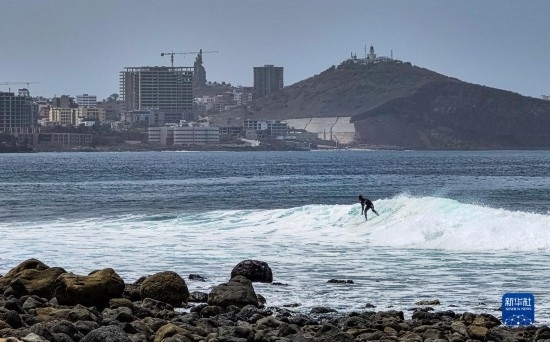 5月14日,一名沖浪愛好者在塞內(nèi)加爾首都達喀爾的海邊沖浪。