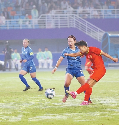 9月22日,亞運(yùn)女足小組賽,中國(guó)女足以16∶0戰(zhàn)勝蒙古國(guó)女足。圖為隊(duì)員在比賽中。本報(bào)記者 張武軍攝