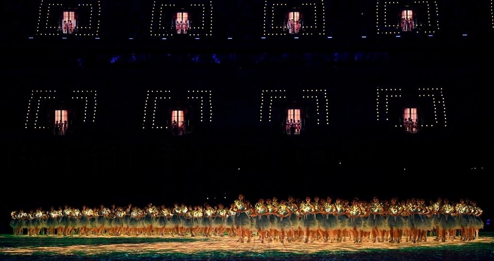 歌聲高潮處,觀眾席中近百扇“幸福之門(mén)”同時(shí)開(kāi)啟。全場(chǎng)萬(wàn)人合唱,現(xiàn)場(chǎng)每一名觀眾都成為開(kāi)幕式“主角”,傳達(dá)“亞洲一家攜手同行”的美好愿望。