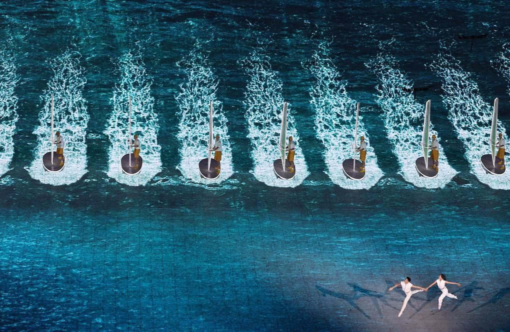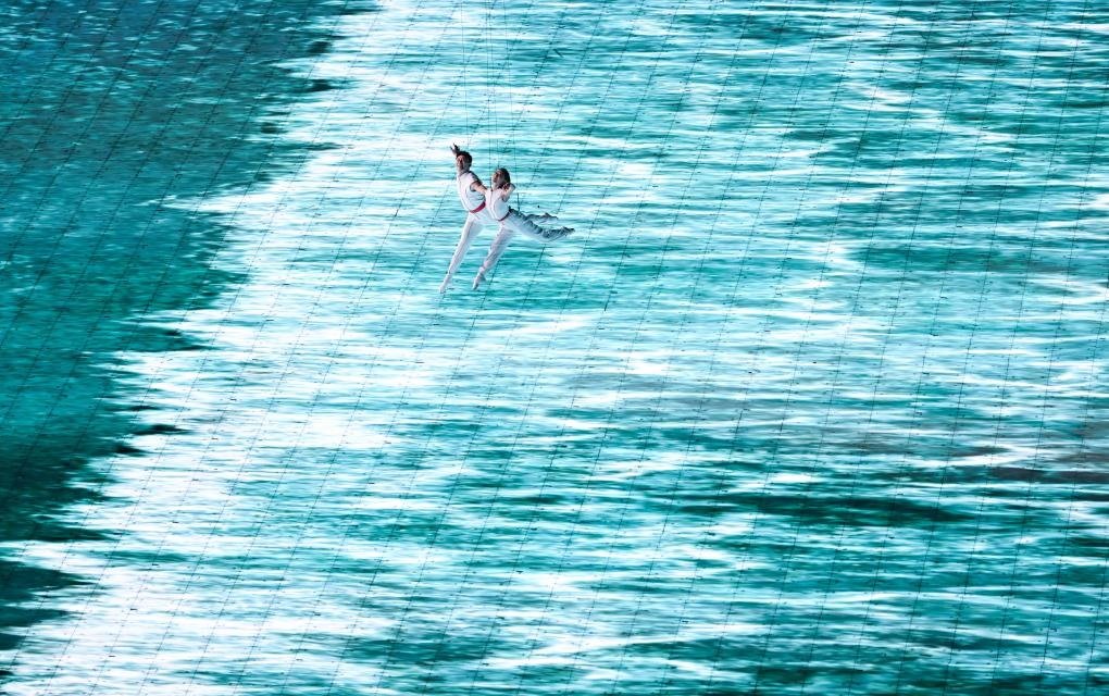 本屆亞運(yùn)會(huì)首次將3D雙威亞技術(shù)應(yīng)用于大型運(yùn)動(dòng)場(chǎng)中。立體飛旋于空中的男女演員與潮共舞,吊著威亞的他們?cè)诳罩型瓿闪烁鞣N高難度動(dòng)作,并與地屏中的浪潮實(shí)時(shí)互動(dòng),踏浪而行,成就了科技與藝術(shù)完美融合。