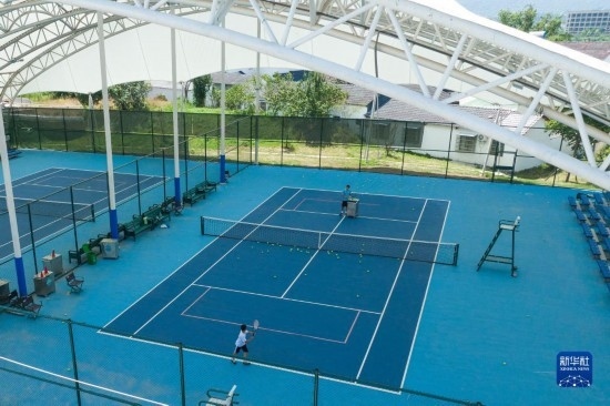 8月9日拍攝的京山文峰網(wǎng)球特色村網(wǎng)球訓(xùn)練場(無人機(jī)照片)。