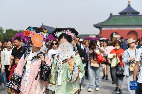 當(dāng)日正值國(guó)慶假期,在北京天壇公園,來自各地的游客在這里參觀游覽。