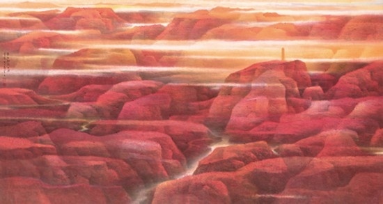 來自上海并深受海派畫學(xué)影響的樂震文、張弛,在宋元及明清山水畫學(xué)上打下了深厚的功底,也因此,他們的傳統(tǒng)山水畫深受日本民眾的歡迎。他們?cè)尉訓(xùn)|瀛多年,轉(zhuǎn)道再度研習(xí)了中國(guó)傳統(tǒng)文人畫。但真正改變他們畫風(fēng)的,卻是他們對(duì)中國(guó)北方大山大水的寫生攬勝。他們鐘情于英雄的太行山,忘情于革命勝地陜北高原,力求通過壯闊雄渾的山巒、連綿逶迤的群峰來表達(dá)他們的時(shí)代感悟,營(yíng)構(gòu)儲(chǔ)存于他們胸中的山川氣象。所謂“山河回聲”,正是這些作品抒發(fā)的中華民族歷經(jīng)歲月風(fēng)華在大好河山之中回響的奮斗激情。