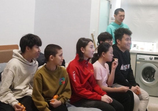 2月9日,努拉娜·阿地力(左三)和教練、隊(duì)友們一起觀看電視節(jié)目。