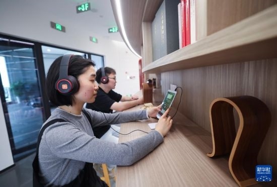 4月16日,在嘉興市南湖區(qū)新時代文明實踐中心,讀者依托數(shù)字化設(shè)備聽“有聲讀物”。