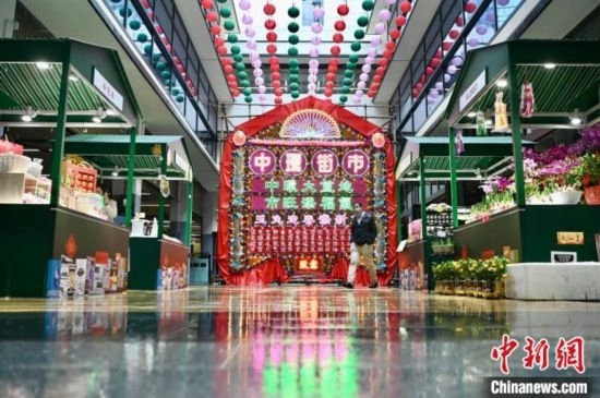圖為中環(huán)街市年宵市集,5米高的大紅花牌及特色排檔推廣“大笪地”特色文化。 中新社記者 李志華 攝