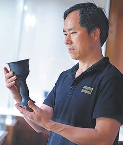 “輕是因為薄。蛋殼厚度約為0.3—0.4毫米,這個薄胎蛋殼黑陶,最薄處只有0.2毫米。”靖安黑陶制作技藝省級傳承人伍映方(見圖,受訪者供圖)一邊介紹,一邊拿起黑陶殘片與雞蛋殼對比展示。