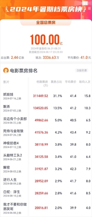 據(jù)網(wǎng)絡平臺實時數(shù)據(jù),截至8月17日23時25分,2024年暑期檔(6月-8月)檔期總票房(含預售)突破100億元。