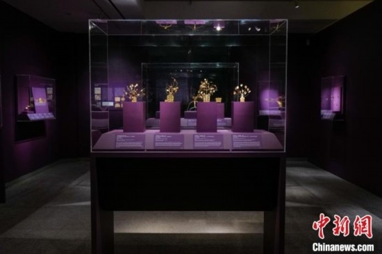 當(dāng)?shù)貢r間9月4日,百余件遼寧三燕文物亮相紐約華美協(xié)進(jìn)社中國美術(shù)館秋季特展《龍城之金:遼寧三燕文物選萃,337-436》。圖為展覽現(xiàn)場的金步搖。 中新社記者 王帆 攝