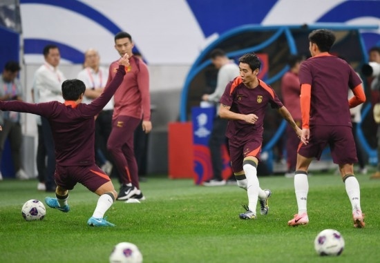 10月14日,中國隊球員韋世豪(中)在訓(xùn)練中。當(dāng)日,中國國家男子足球隊在山東青島進(jìn)行賽前訓(xùn)練。新華社記者 李紫恒 攝