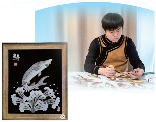 圖①:手工藝人在制作魚皮畫。圖②:魚皮畫作品。以上圖片均為同江市委宣傳部提供