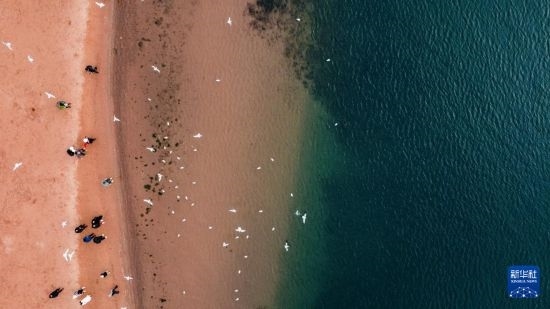 1月12日,游客在撫仙湖邊游玩(無人機(jī)照片)。