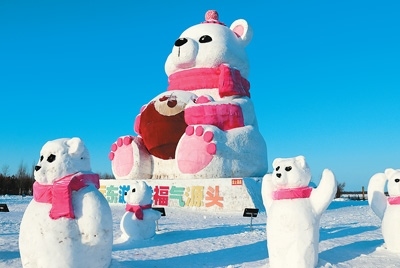 撫遠(yuǎn)市濱江公園里的“莓莓熊”雪雕,吸引不少外地游客前來(lái)“打卡”。