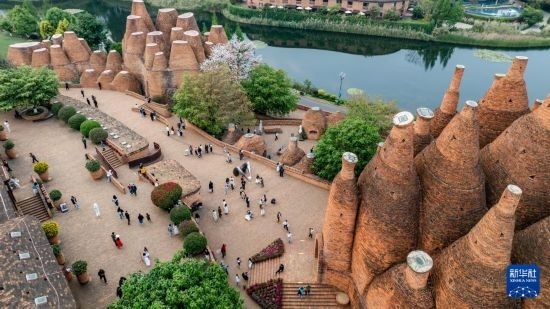 人們在云南省紅河州彌勒市東風(fēng)韻小鎮(zhèn)游玩(無人機(jī)照片,4月5日攝)。