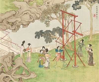 秋千,古稱“千秋”,可追溯至春秋時期,后改為“秋千”。據(jù)《荊楚歲時記》記載:“春時懸長繩于高木,士女衣彩服坐于其上而推引之,名曰打秋千?!痹诠糯迕鞴?jié)更是有著秋千節(jié)的別稱,可見古人對春日蕩秋千的喜愛。