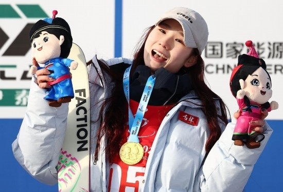 劉夢婷的雪板上有一個(gè)“谷”字,她解釋說這是谷愛凌同款定制雪板?!拔液芟矚g她的風(fēng)格,把她作為我的榜樣,激勵(lì)我進(jìn)步?!?/p>