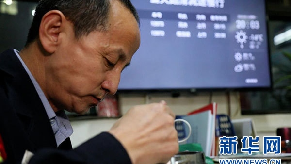 馮冰一邊吃飯,一邊用余光看著調(diào)度表上的時間。新華網(wǎng) 吳銀冰 攝