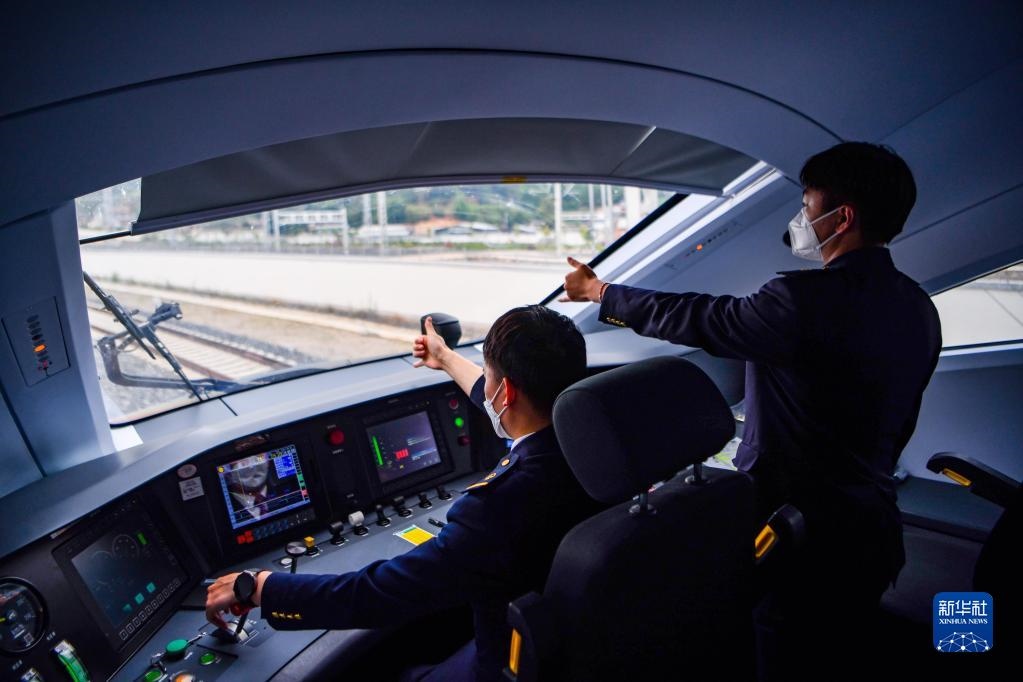 列車(chē)司機(jī)駕駛復(fù)興號(hào)列車(chē)行駛在中老鐵路上(6月1日攝)。新華社記者 江文耀 攝